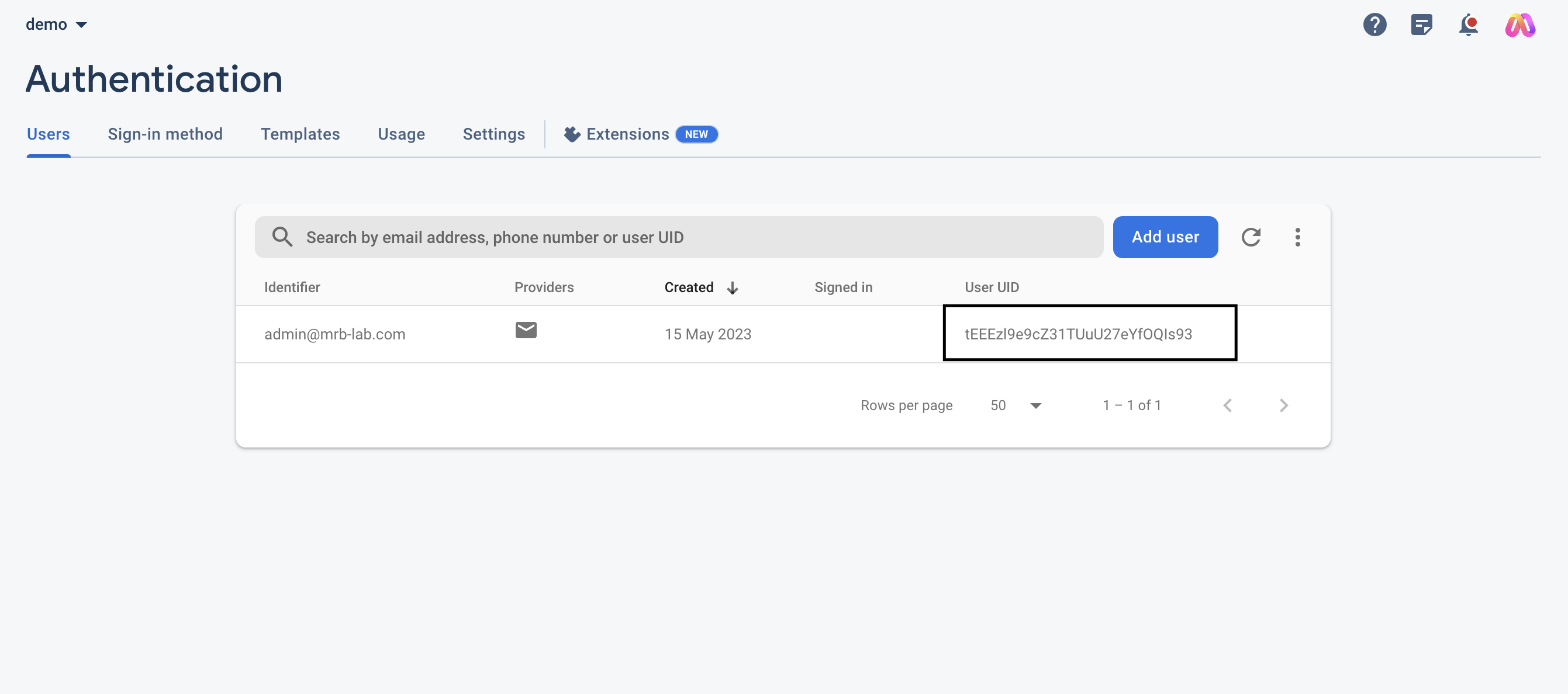 3. Copy The **User UID** which is required for the next step. Now you have to create a record of the account you have created in the database.