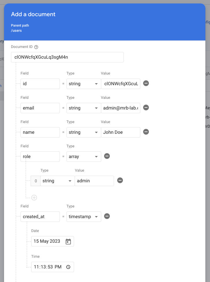 6. Use the **user Id** that you have copied as **Document ID**. Create a field named **id** and use the **user id** as value (same as Document ID). Create another field named **email** and use your admin **email** as value. Create another field named **name** and enter **your name** as value. Create another field named **created\_at** and the type must be **timestamp** and select **a date and time** as value. Create another filed named **role** and the type must be an **array** and write **admin** as the first value of that array.