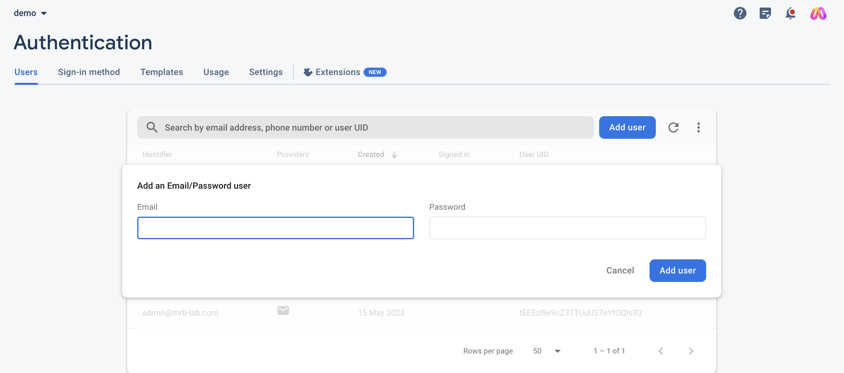 2. Now go to the **Users** tab and click on the **Add User** button and create a new account by providing your email and password.