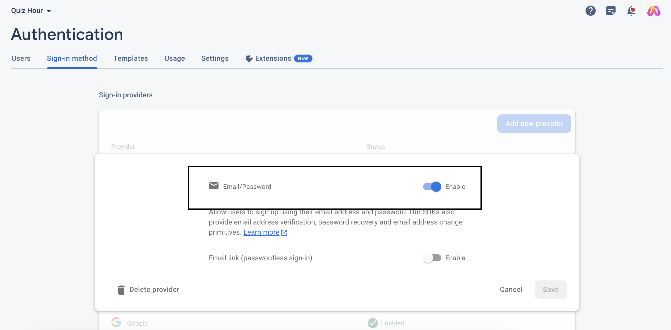 1. From your Firebase Console > Your App, go to the **Build > Authentication > Sign-in method** tab and Enable **Email/Password** and Save it.