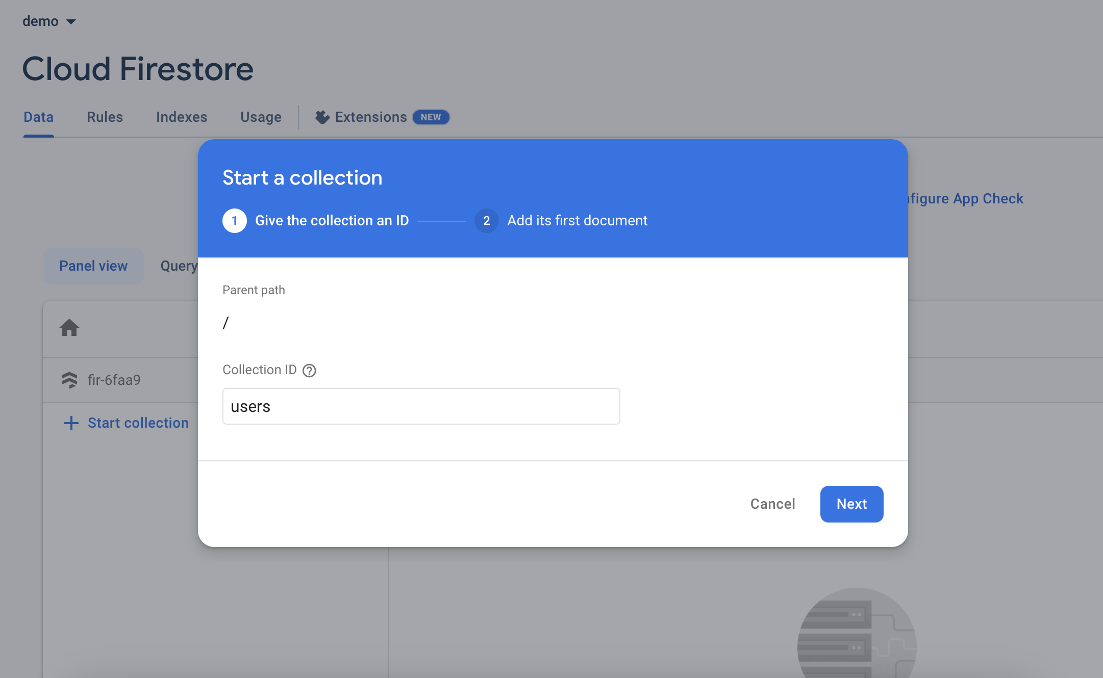 4. Go to the **Build > Firestore Database** and create a collection named **users** by clicking on the **Start Collection** button.
