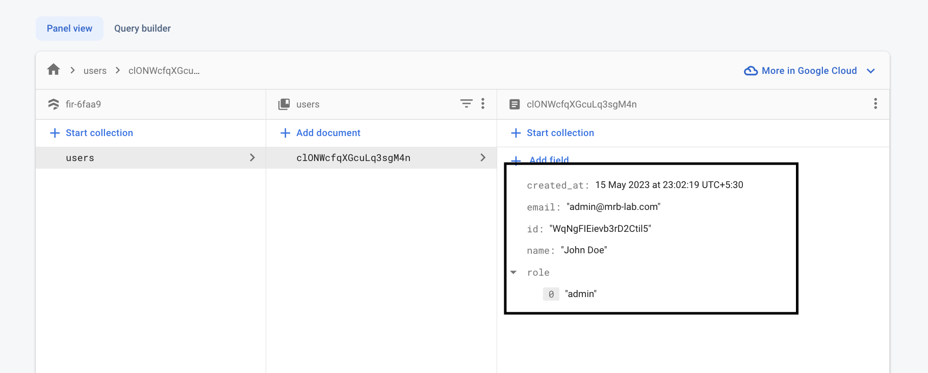 7. Save it and after creating the user collection and document, your document details will look like this: